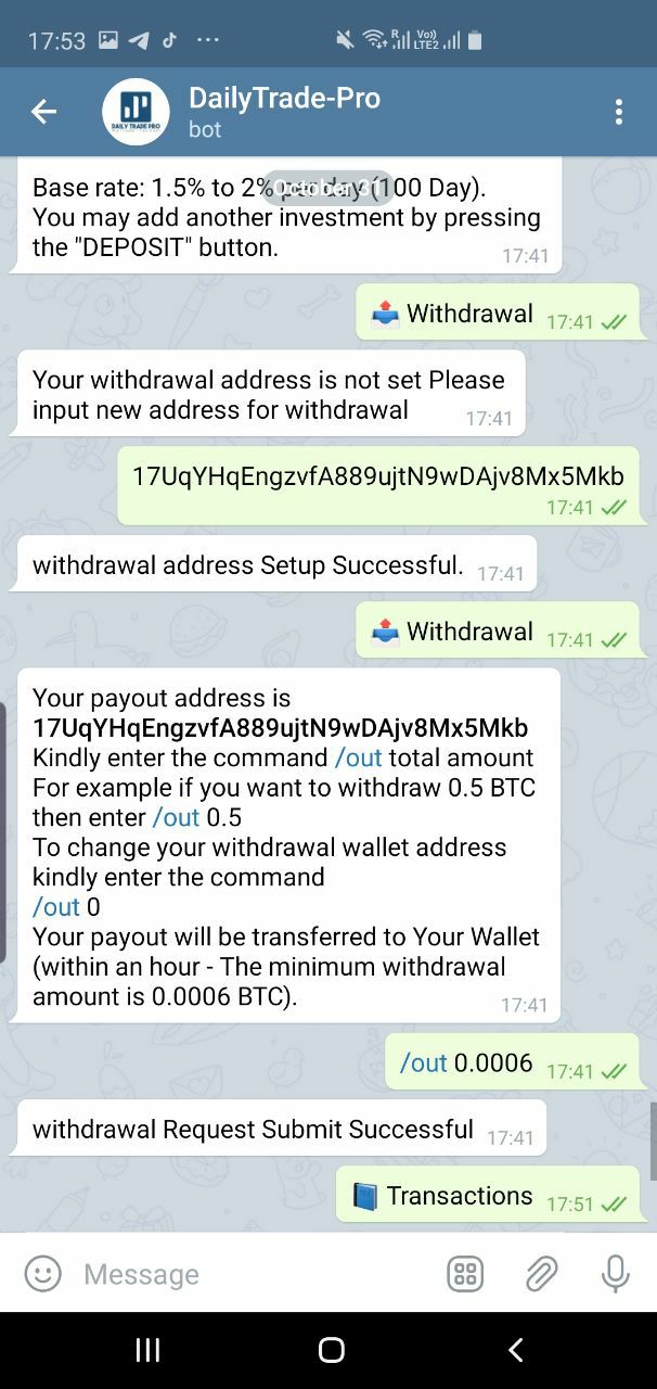 💹Daily Trade Profit is a Mining & Trading Company. This Bot is registered under the Company name Daily Trade Pro LTD in UK. We do Tradings in different platform like Forex Market, Share Market and also in Crypto Market.