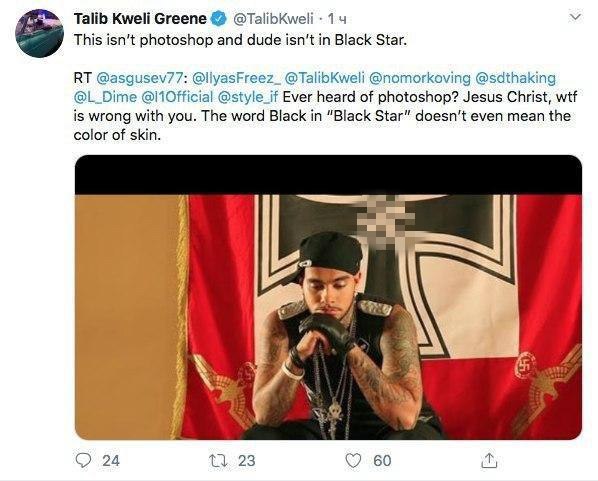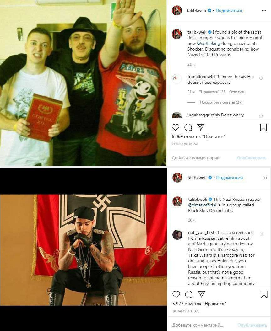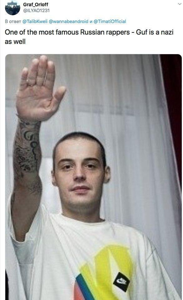 Но Талиб не повёлся: ответил, что так думать — это тоже расизм. После чего к нему понабежали наши отечественные рэперы и просто тролли, убеждающие, что русские хип-хоп-исполнители вправду все буквально гитлеры. В качестве доказательств показывали фото Тесака (с подписью, что это Oxxxymiron в юности), фото Михаила Боярского с Виктором СД (подпись: «Знаменитый нацистский рэпер Эмси Каналья»), Евгения Понасенкова с пистолетом и даже Тимати на фоне нацистского штандарта из фильма «Гитлер капут!».
