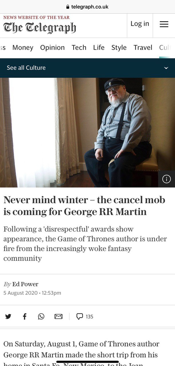 The Telegraph опубликовала колонку, достойную лучших советских передовиц. Писатель на церемонии «Хьюго» (премия за научно-фантастическую литературу, учреждена в 1953 году) посмел не осудить Говарда Филлипса Лавкрафта за расизм и Джона Кэмпбелла (редактора, открывшего миру Артура Кларка и Айзека Азимова) за оправдание рабства! И даже наоборот — признать их значение для литературы! Ещё хуже: вручая премию, он неправильно произносил имена китайских авторов и журнала, который издают чёрные трудовые негры. Мартину сразу припомнили всё: и то, что в его книгах насилуют женщин, и то, что их там не считают за людей. Странно, что ему не предъявили белый цвет кожи Таргариенов. Но ещё предъявят, не сомневайтесь. В конце автор спрашивает, не пора ли уже cancel зарвавшегося писателя, как до того отменяли классических авторов.