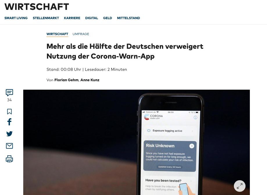В настоящее время около 22 миллионов немцев загрузили приложение Corona. Кроме того, не все пользователи, получившие положительный результат коронного теста, сообщают об этом в цифровом виде. Только на рекламу приложения Германия тратит 13 миллионов евро.
