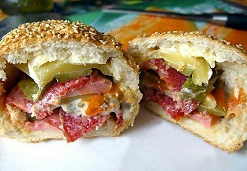 Теперь принимаемся за булочки. Если у вас в наличии имеются небольшие (диаметром до 8 сантиметров) булочки, разрежем их пополам вдоль. Если у вас булочки покрупней, вам потребуется примерно штуки три. Разрезаем каждую из них на две части.