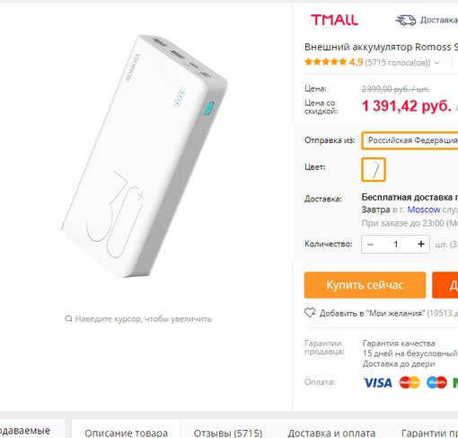 ✊ Внешний аккумулятор Romoss Sense 6P 20000 мАч за 804,79 руб. с промокодом Tmall07new