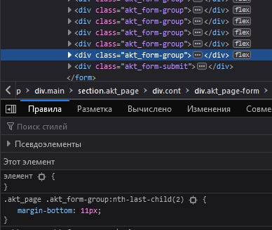 akt_form-group:nth-last-child(2) - так цепляется за последний, а если akt_form-group:nth-last-child(1), то ничего цепляетсяМD