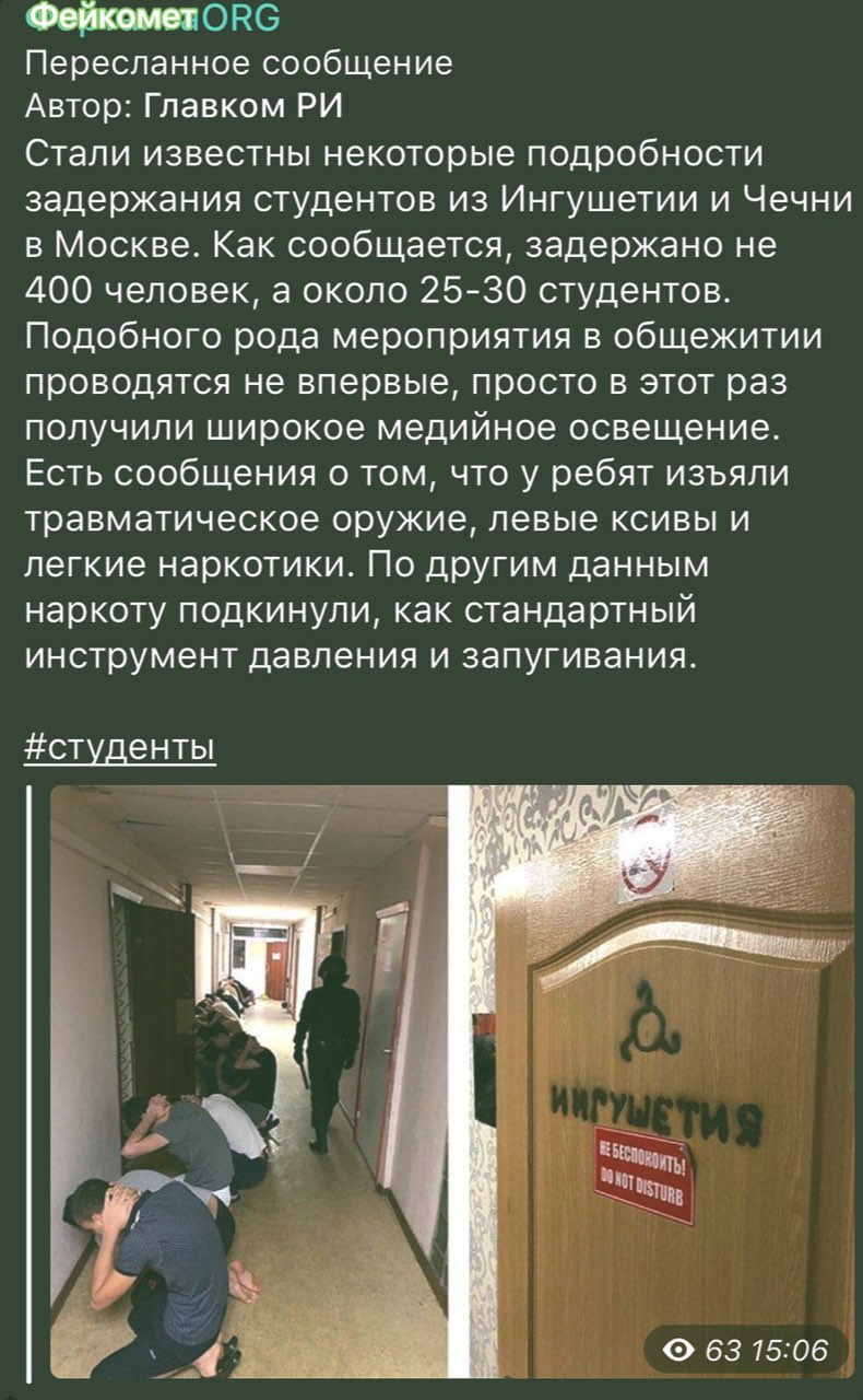 По версии "Фортанга.орг" мусульмане ингуши студенты геологи всего лишь имели при себе "легкие" (считай - халяльные) наркотики и травматическое (считай "игрушечное") оружие. Наркоту им подкинули, как и всем наркоманам ингушам, которых ежедневно ловят в Ингушетии. А молодежные группы "Антилирика" в республике тоже наркоту ребятам подкидывают и видео постановочные с фамилиями записывают?