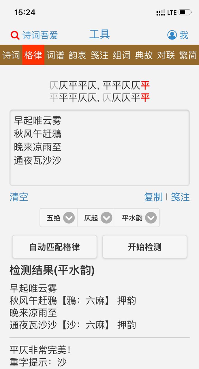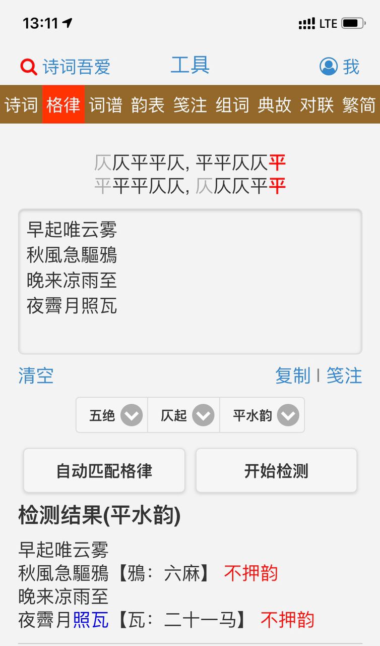 И вот конечный результат, в котором заодно заменил 驅, потому что он не подходил в тоновый рисунок и вернул 午, потому что указание на временя суток хотел иметь в каждой строке. Ради рифмы отказался от остановки дождя и лунного света ночью, но так мне даже больше нравится.