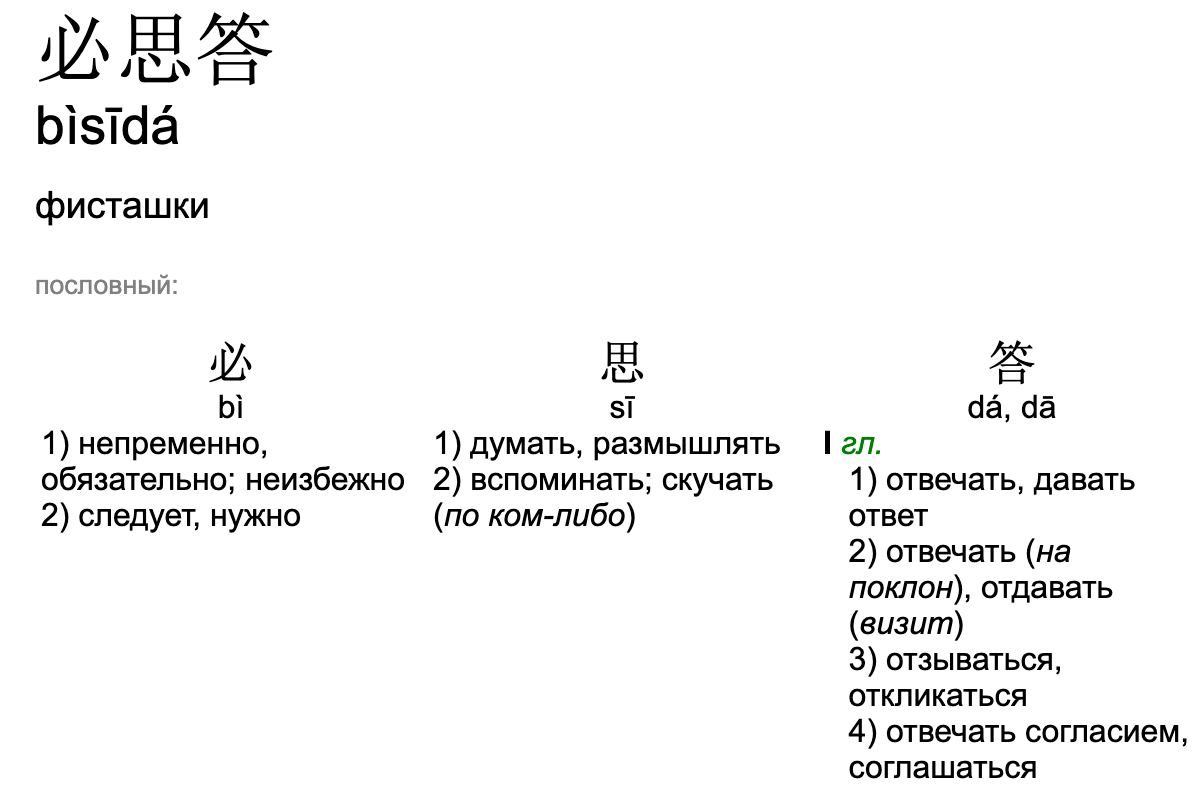 Другой, очень забавно звучащий вариант: 必思答 bìsīdá - это фонетическая транскрипция слова pistachio, для которой переводчик выбрал иероглифы с хорошими значениями (но, конечно, не имеющими отношения к фисташкам): обязательно + думы + ответ. Немного жаль, что этот вариант сейчас не используется.