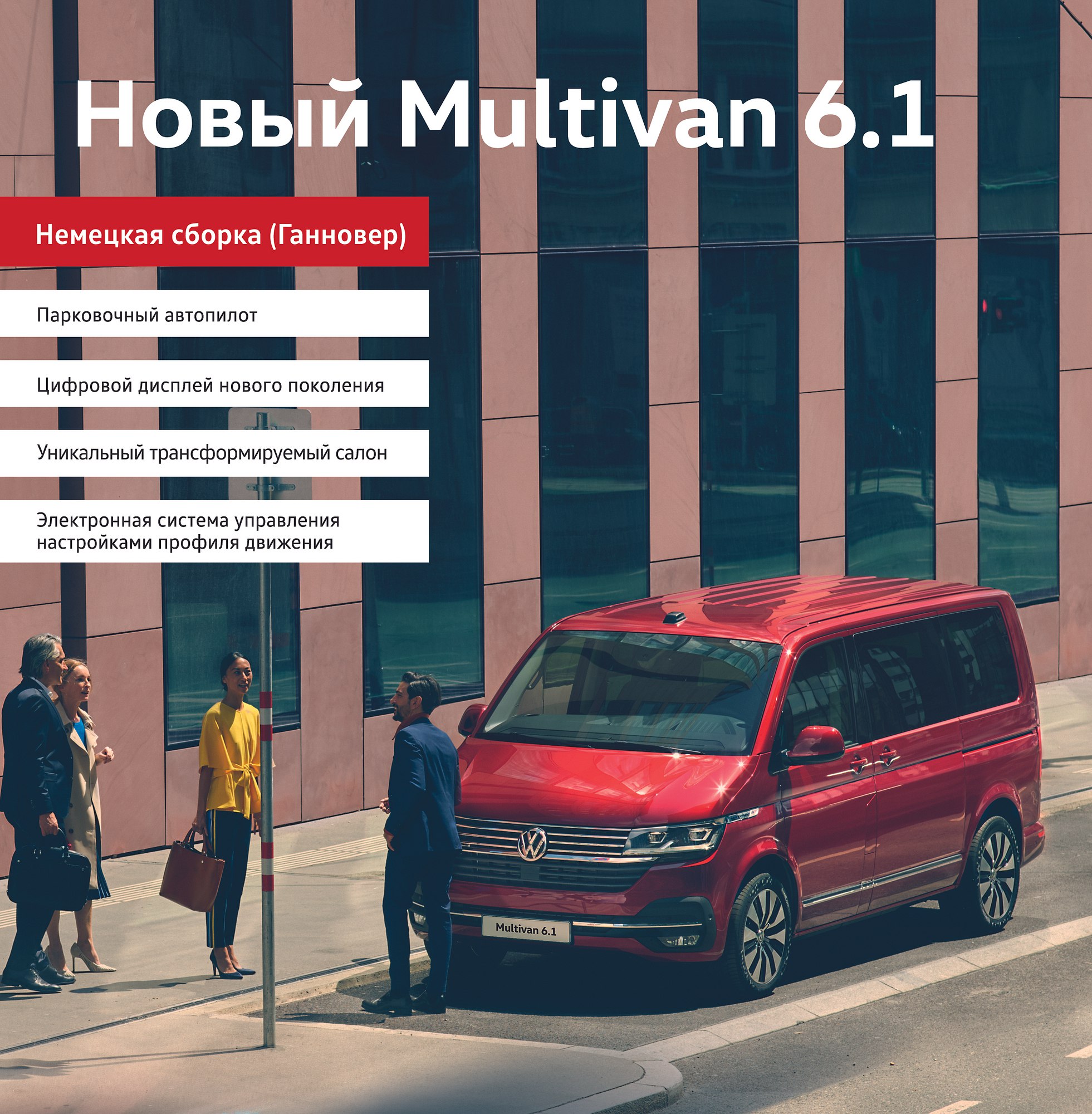 — Минивэны нового поколения Т6.1: Multivan (бизнес-класс), Caravelle (вместительный (до 9 мест) автомобиль), Transporter (цельнометаллический фургон) и California (уникальный кэмпер со всем необходимым внутри).