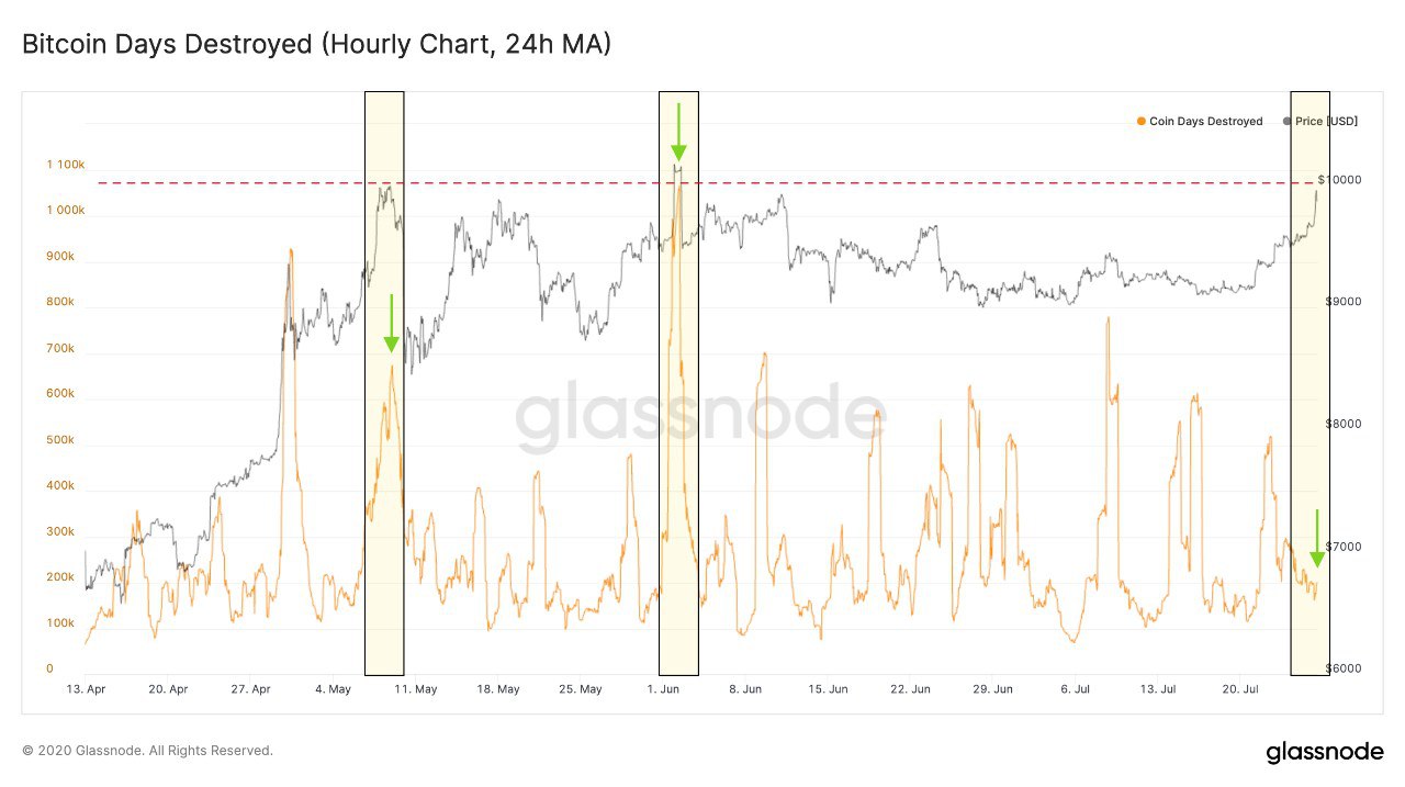 В противоположность предыдущим случаям достижения BTC цены в $10 000 USD, в этот раз не наблюдалось возрастание Bitcoin Days Destroyed(буквально, уничтоженные биткоин-дни). Т.е. не было притока на рынок "старых" монет, которые участники предпочитают потратить, чем хранить дальше.