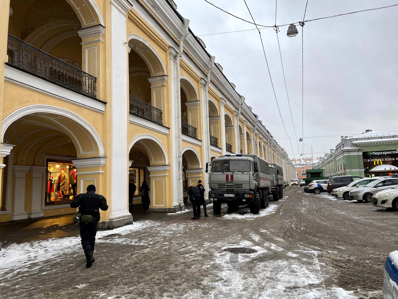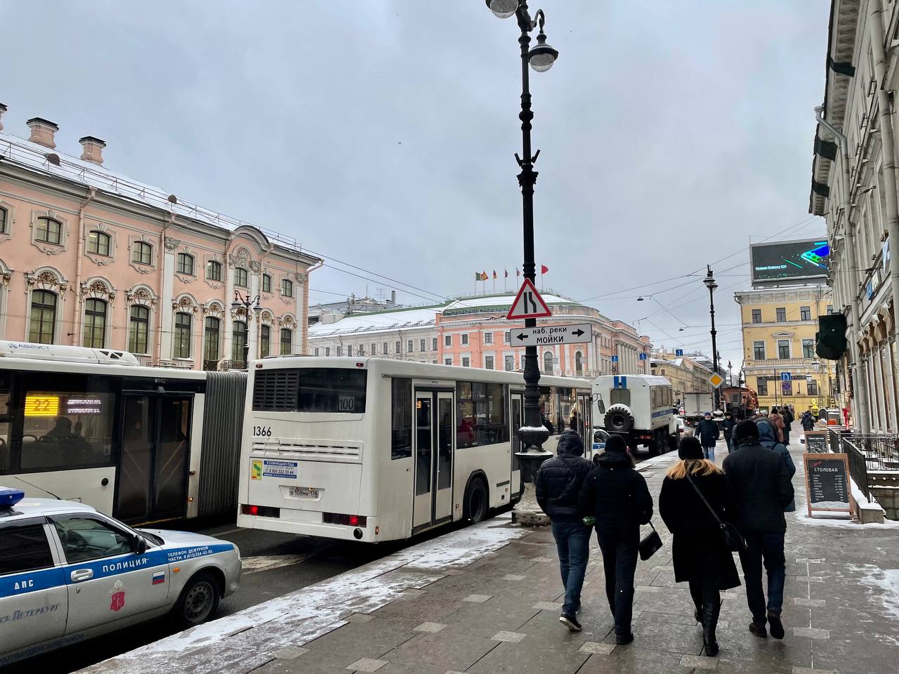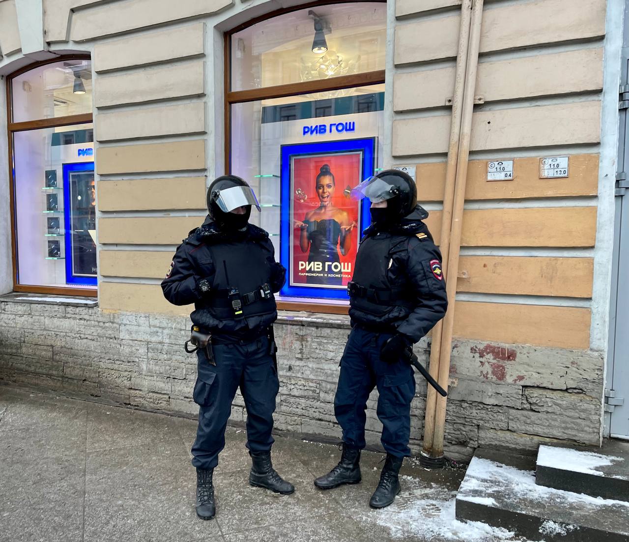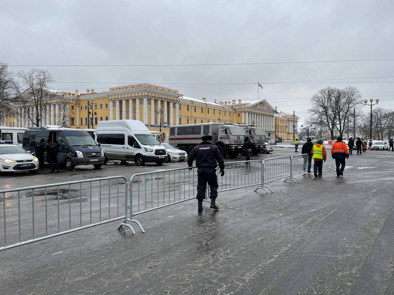 Решение по замене Алексею Навальному срока с условного на реальный все ближе — а у Гостиного двора полицейские с закрытыми жетонами начали останавливать прохожих и проверять у них документы. На Дворцовой тем временем выстроились силовики со щитами, а снегоуборочные машины вдоль Невского готовы перекрывать улицы.