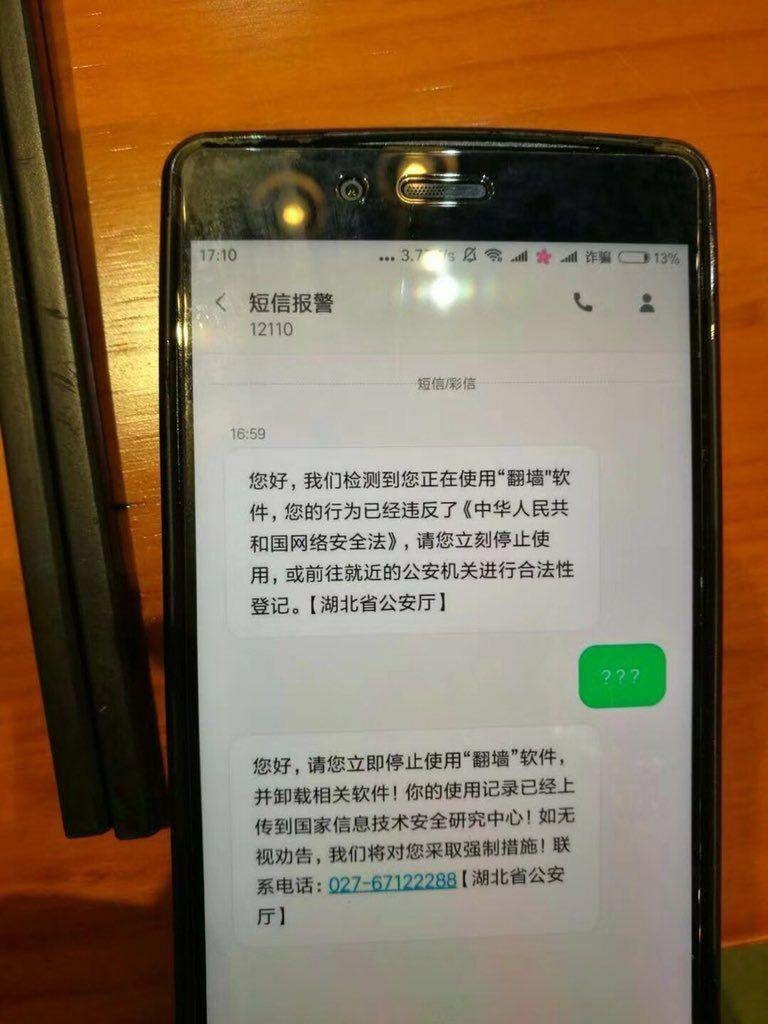 «Мы обнаружили, что вы используете VPN-клиент, тем самым нарушив закон о безопасности в интернете. Просим вас немедленно прекратить использование VPN-клиента и других связанных приложений. История посещений уже передана в Государственный центр исследования и защиты информационных технологий».