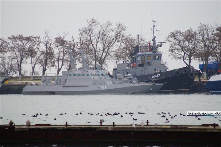 Задержанные украинские катера и буксир в порту Керчи. 3 судна и 23 (24) члена экипажа. Раненых трое — одного якобы ранил свой офицер после отказа стрелять по злым русским.