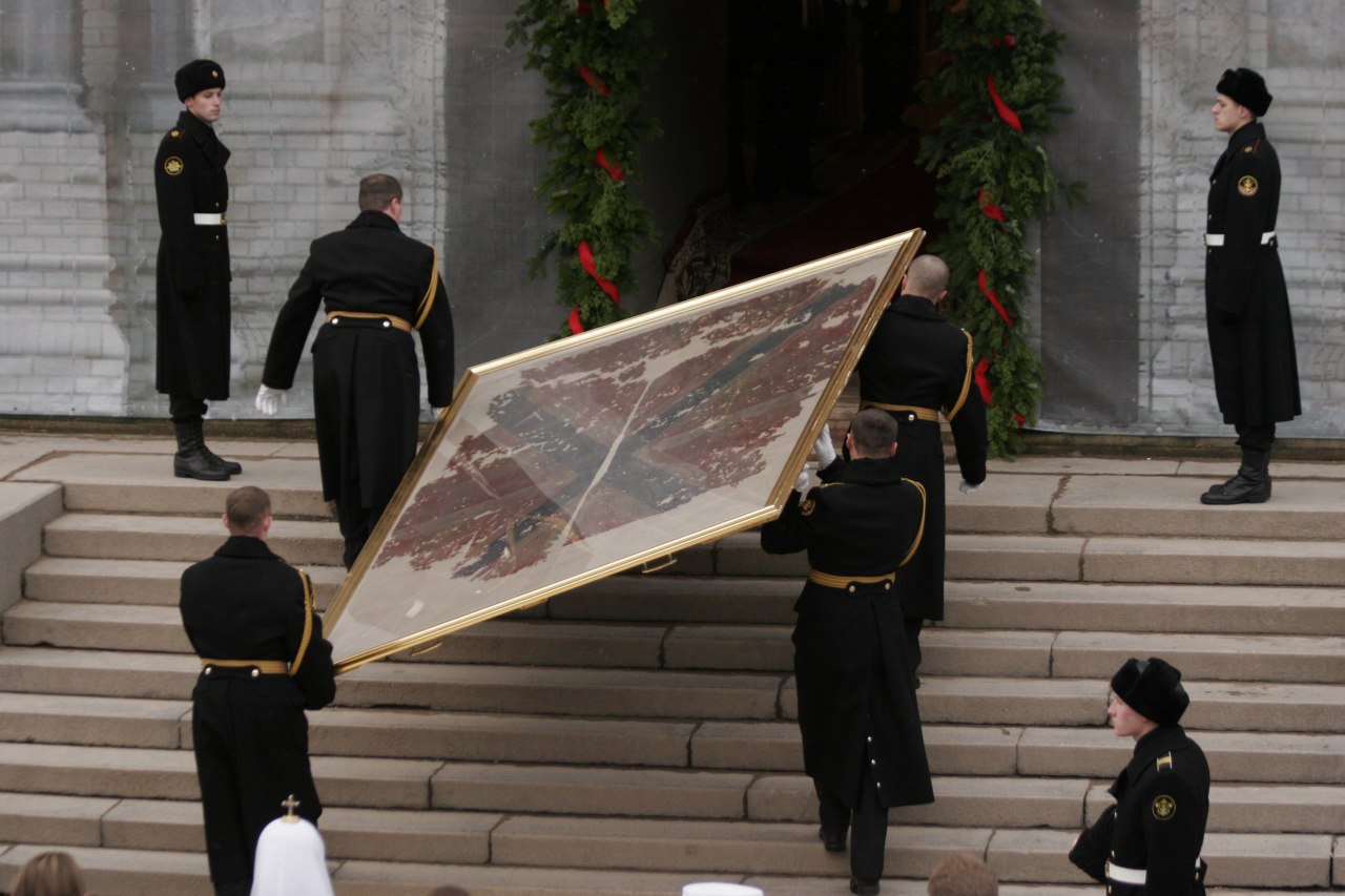 На фото: гюйс «Варяга», арендованный у корейцев, заносят в Кронштадтский морской собор. 20 ноября 2011-го.