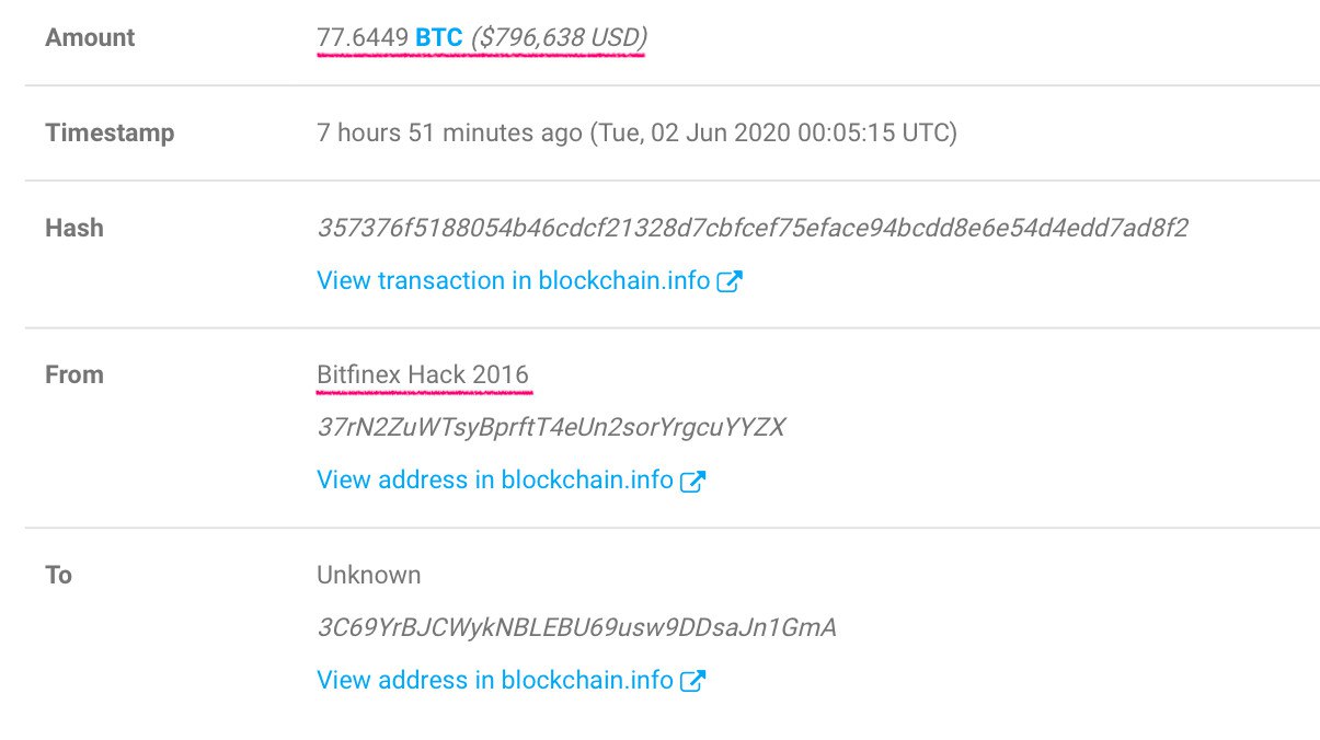 Сегодняшний рост курса Биткоина заставил оживиться и хакеров. Вот, например, ребята отправили 77 BTC, которые украли у Bitfinex в 2016 году. Напомним, тогда биржа лишилась эквивалента 72 миллионов долларов.
