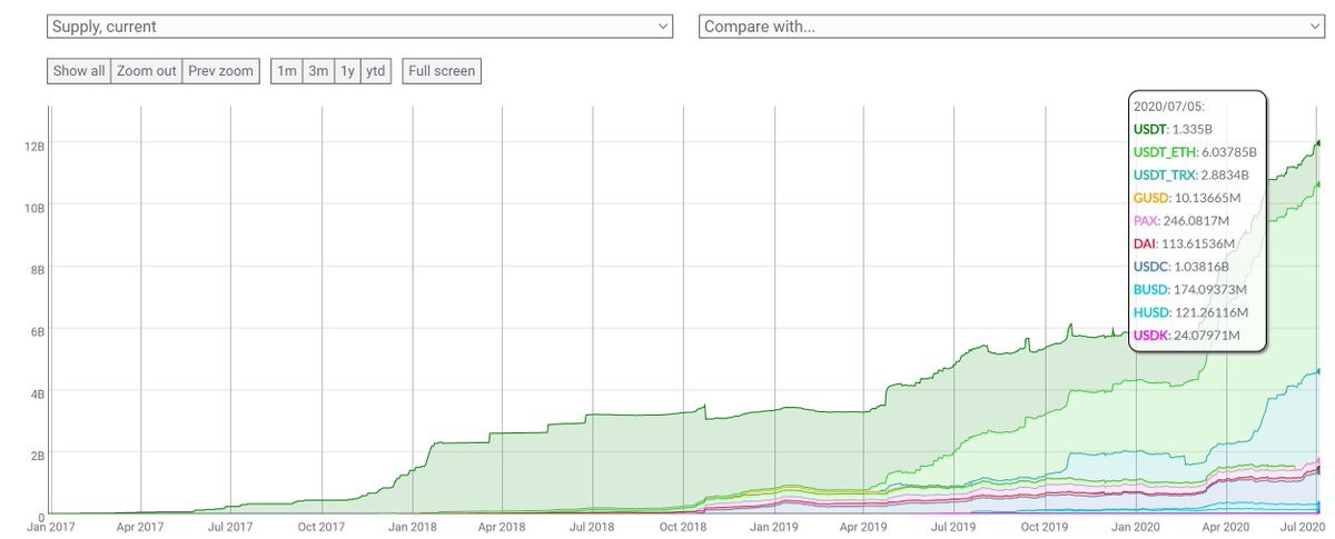 Общее предложение стейблкоинов удвоилось с начала января. По данным аналитиков CoinMetrics, показатель стремительно приближается к отметке в 12 миллиардов. Ну а большая часть объёма рынка приходится на USDT Tether на базе Эфириума.