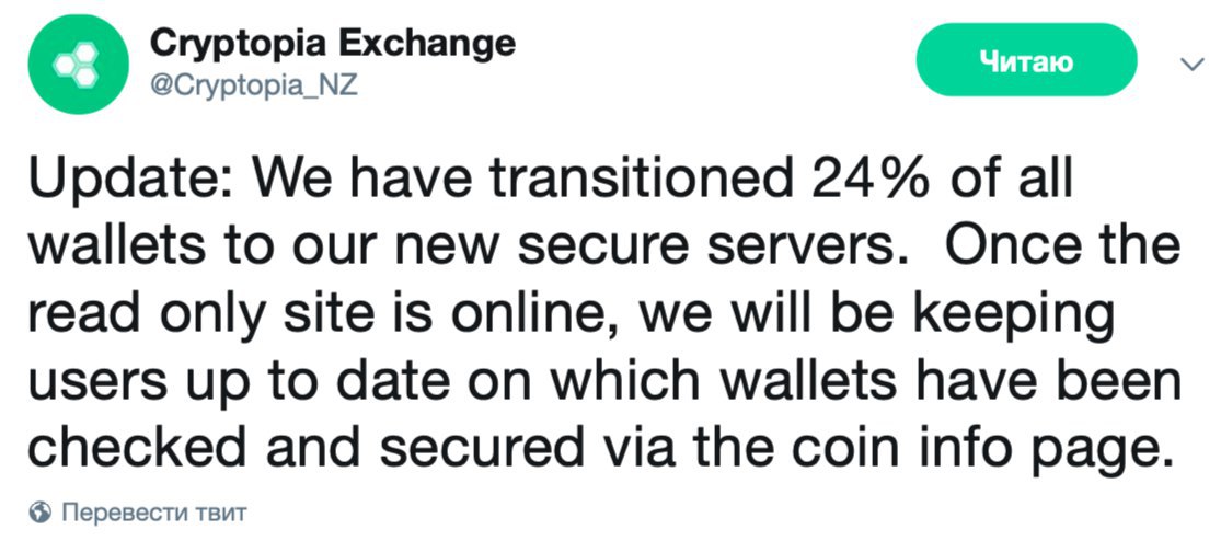 Сегодня ночью ребята из Cryptopia перевели на новые безопасные серверы 24 процента всех кошельков. Биржа появится в онлайне уже в понедельник, то есть спустя полтора месяца после взлома.