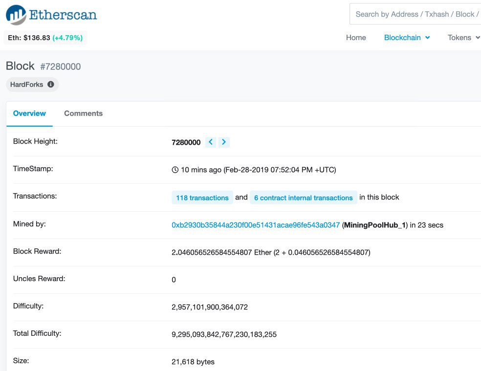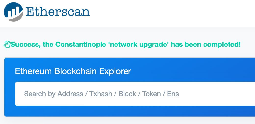 Если вы вчера рано легли спать, есть хорошие новости. Хардфорк Эфириума прошёл успешно. Константинополь работает, вознаграждение снизилось, блоктайм приходит в норму.