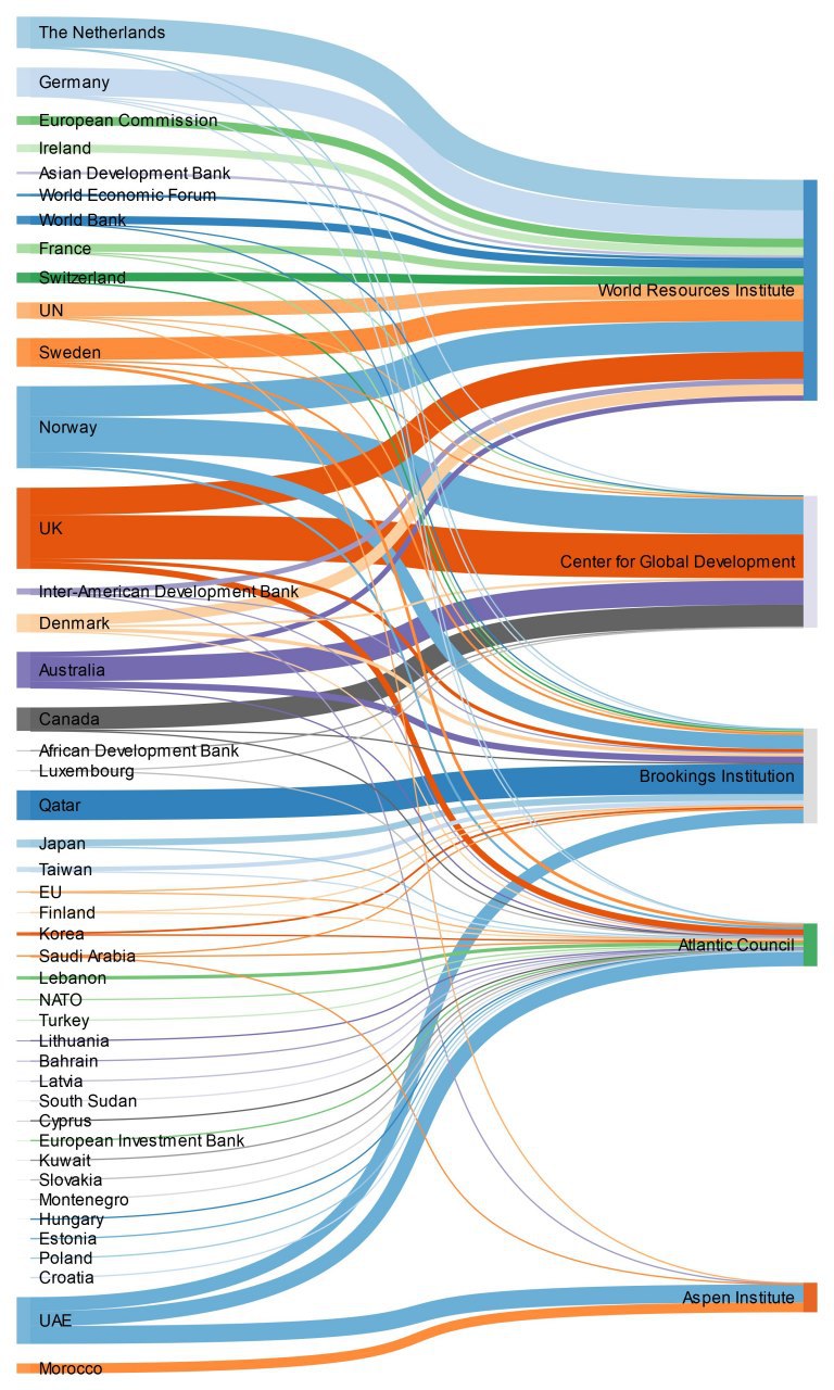 2️⃣ Самыми главными получателями зарубежных фондов являются такие уважаемые организации как World Resources Institute, Center for Global Development, и Brookings Institution;