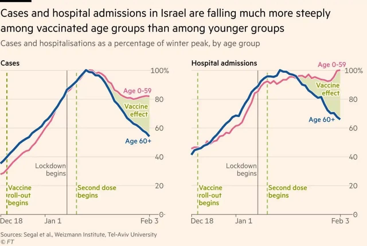Первые результаты в целом очень хорошие и обнадёживающие, на графике видно, что спад заболеваемости и госпитализации у вакцинированной в первую очередь группы 60+ значительно превышает аналогичные показатели у более молодых. Вакцина определённо работает, это хорошо видно в статистике и на приведённых графиках.