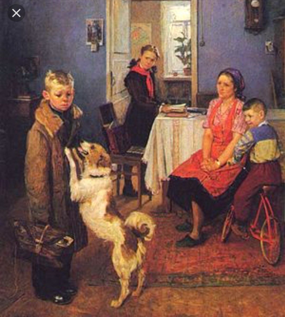 "Опять двойка" картина - стоит краб грустный после рамптеста, его встречают сидящие Настя и Полина, сидит на велосипедике флек и радостно скачет кукей.