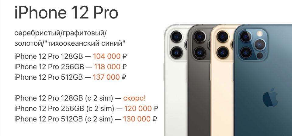 В общем, заказал себе 12 Pro в России, жду доставку на следующей неделе. Разумеется, тихоокеанский синий, как же иначе? А потом пошел посмотреть - как там у барыг? Раньше двухсимочные аппараты продавались с нехилой такой наценкой в 15-20 тысяч к официальной цене.